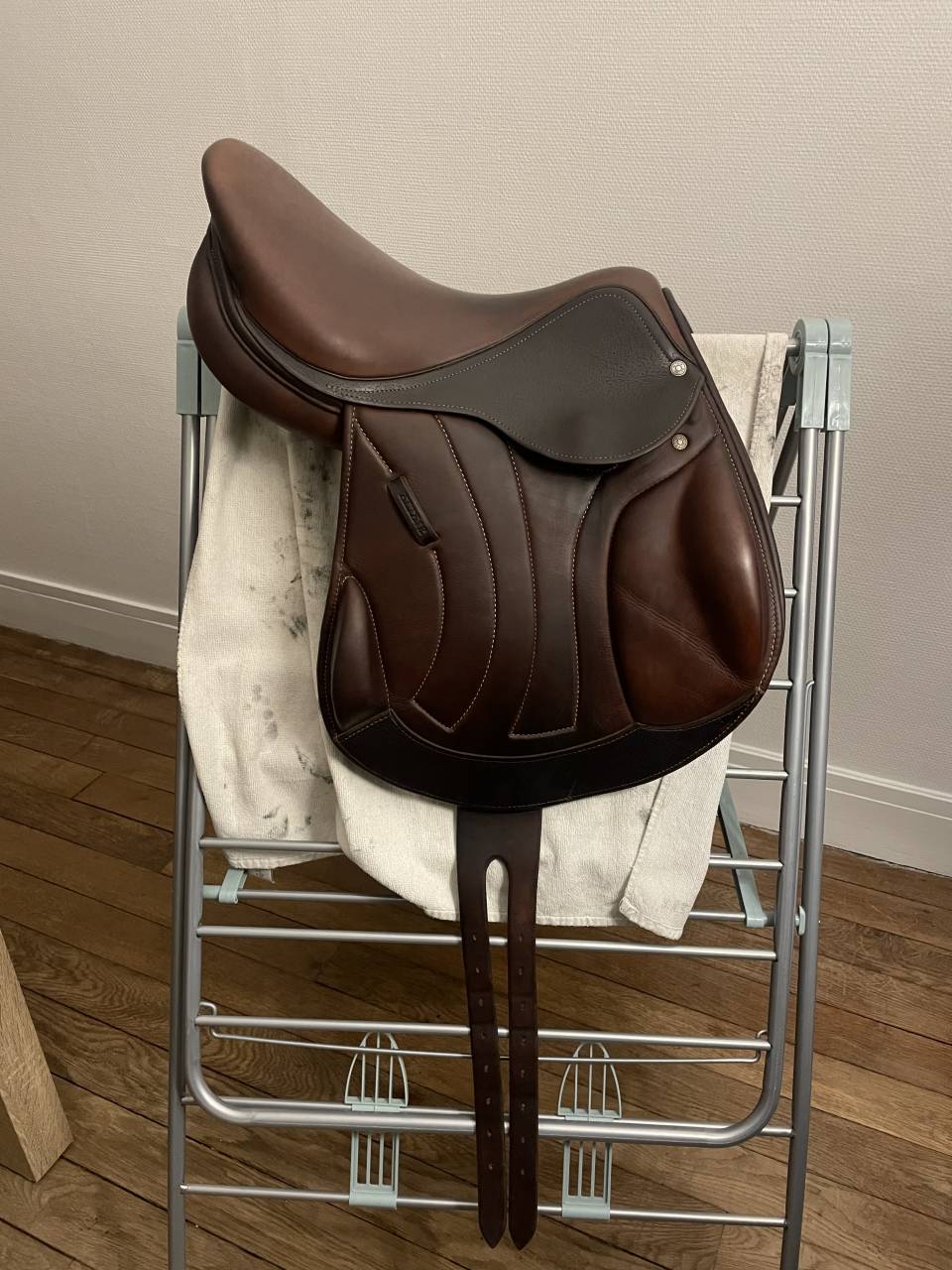 Les seuls accrocs sont dus à un stockage non optimal par ma famille. Ils sont visibles sur les photos, mais légers et imperceptibles à cheval, et n’altèrent en rien l’utilisation de la selle.