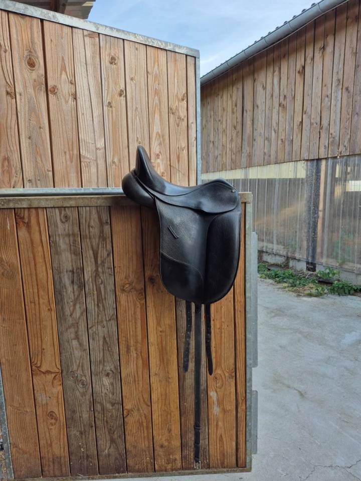 Bonjour je vends ma selle de dressage Isabelle Werth. La selle a été vérifiée par une saddle fitter, qui a également changé le système à coussin d'air par un reflockage laine de très bonne qualité. La selle n'a été utilisée que une douzaine de fois avant que ma jument se blesse. Aussi, la laine n'a pas encore pris la forme du dos de ma jument et pourra se mouler et s'ajuster au dos de votre cheval. Il est possible de retourner au système coussin d'air étant donné que j'ai gardé les panneaux (dernière photo), cependant l'un d'eux est abimé, mais il est possible de contacter la marque pour en récupérer (d'après la saddle fitter, mon but était d'adapter la selle à ma jument et le reflockage laine était plus pratique pour cela).