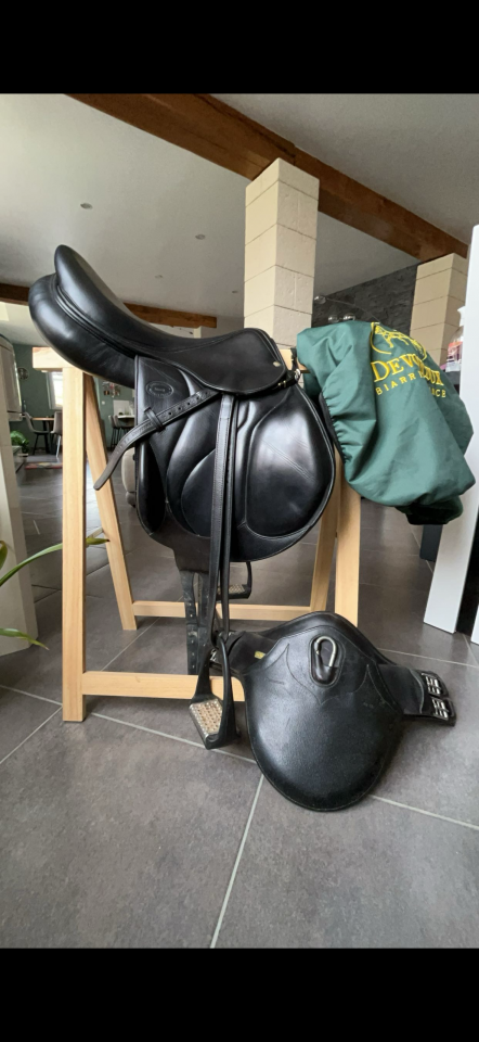 Selle devoucoux chiberta 17,5 / 2A, l’arçon a été changer. Elle a toujours été très bien entretenue. Elle est vendue avec sa housse et peut être vendue avec une bavette devoucoux 60cm et des étrivières devoucoux. Possibilité aussi de rajouter une sangle 60cm.