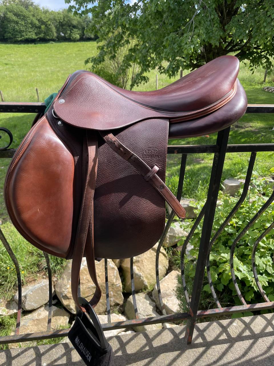 Je vends ma selle d'équitation Devoucoux pour le saut d'obstacles. Cette selle de très haute qualité est en excellent état, avec peu d'usure visible.