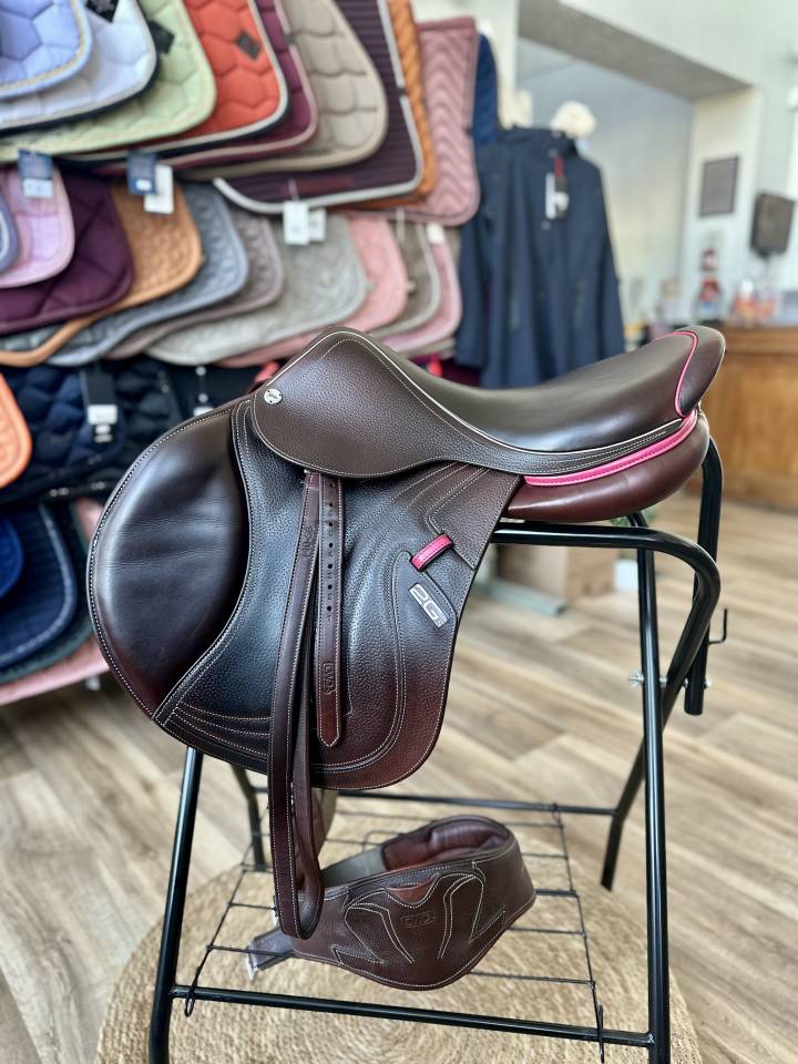Selle CWD Mademoiselle 2GS Année 2021, utilisée 1 an. Donc état impeccable quasi neuve. Siège 17 pouces. Cuir marron, doublé veau. Liseré rose. Vendue avec couvre selle, étrivières et sangle anatomique.