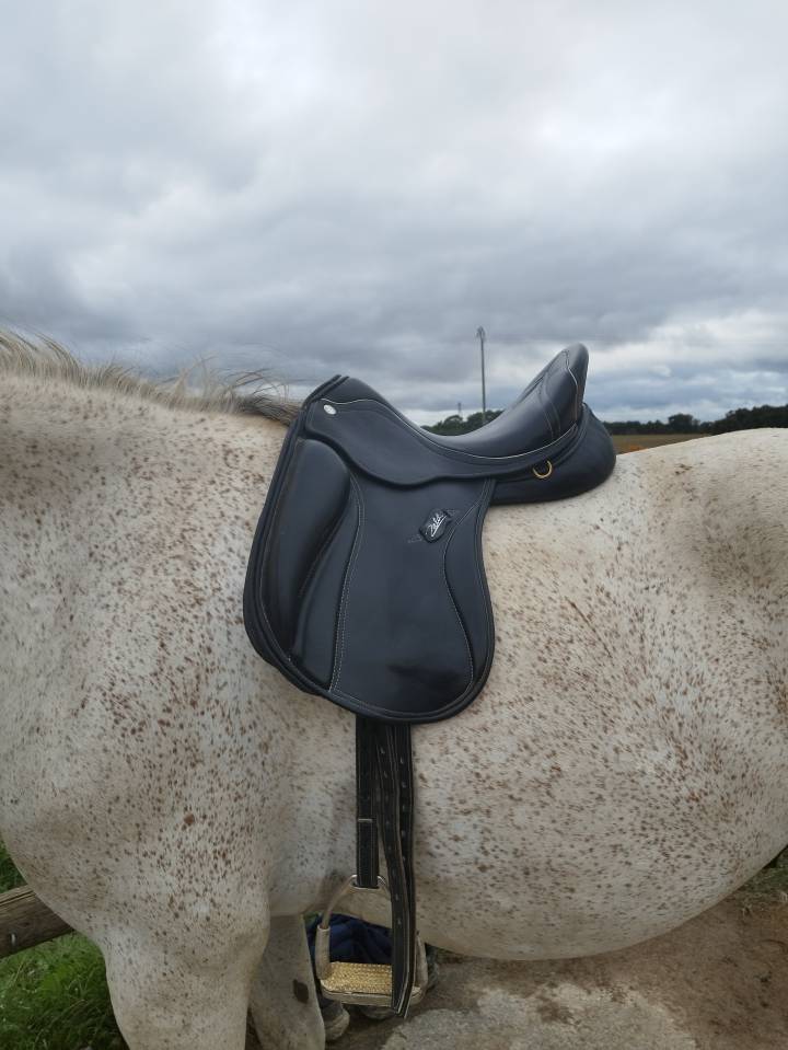 Je vends ma selle de dressage Zaldi San Jorge toutes options (siège rembourré, découpe ergonomique aux épaules et matelassures en latex). Sanglons en forme de V qui permettent à la selle de ne pas avancer.
