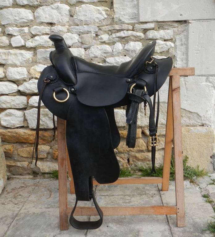 Très confortable Sanglage 3 points. 17 pouces Poids 9 kg équipée Bon état, toujours entretenue. Fait pour un cheval ayant peu de garrot ou garrot noyé, gullet 4.5 cm Epaules normales à larges, ouverture arcade 30/32 cm, ou quater. Gouttière 8 cm Etriers western composit (ultra léger) neufs. Possibilité de l'équipé avec étrivières et étriers standards.  Pour tous renseignements sur ces selles allez voir le site de la sellerie Courtois.