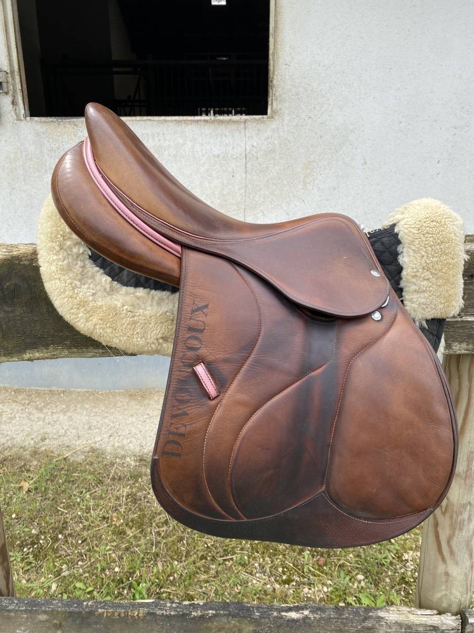 A vendre, selle Devoucoux Biarritz S 17' de 2018 avec un liseré rose. En bon état, a toujours été bien entretenue mais présente quelques marques d'usure.