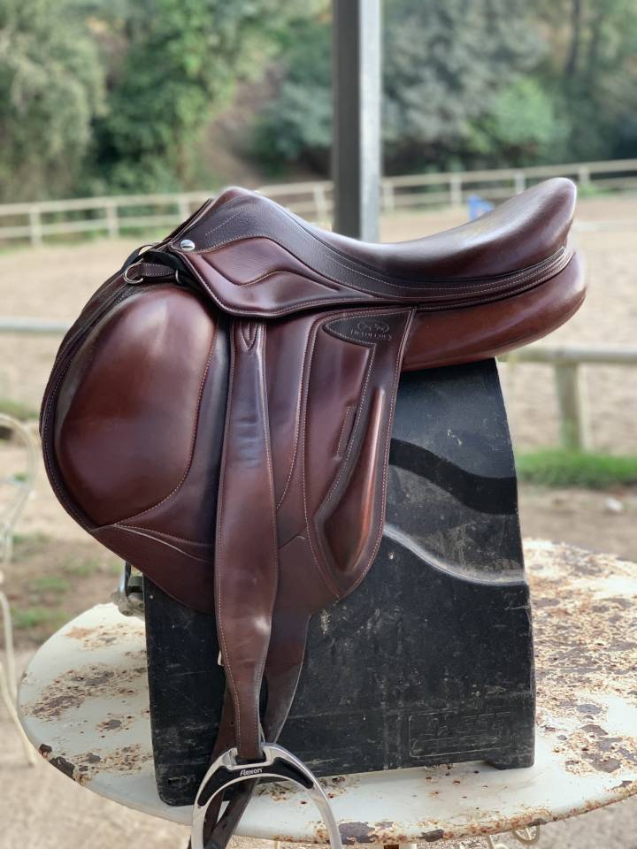 Can be sold fully equipped with Devoucoux 60cm bib strap, Devoucoux size s flat stirrup leather, saddle protector and ultra grip flex on sloping seat stirrup,