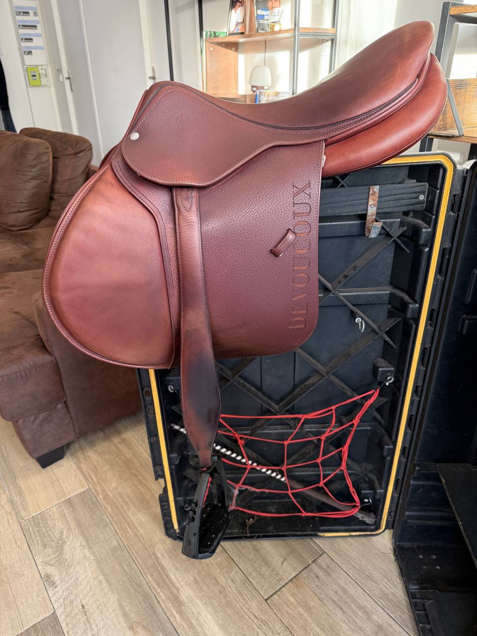 Selle devoucoux complète : étriers, étrivières anatomique (L) et sangle bavette (135)