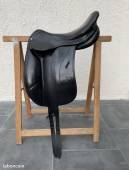 Selle dressage monoquartier noire Forestier , 17 pouces .Ne convenait plus à mon cheval ( épaules larges et garrot fort) .Légère , confortable .Achetée d 'occasion avait déjà quelques petits défauts ( griffures )