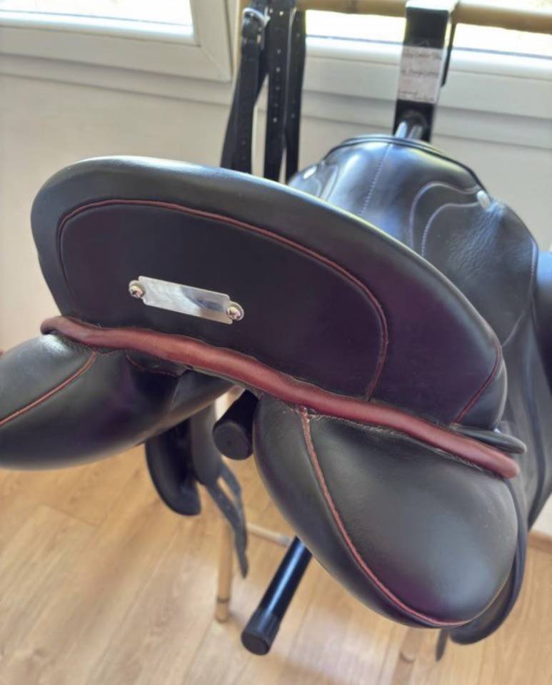 C’est une 17,5. Le siège est creu. On est sur un arçon en bois taille 2. Plaque en acier pour graver le nom de votre cheval dessus.
