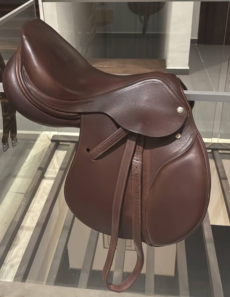 À vendre : selle mixte Éric Thomas, taille 17,5 pouces, en cuir havane.