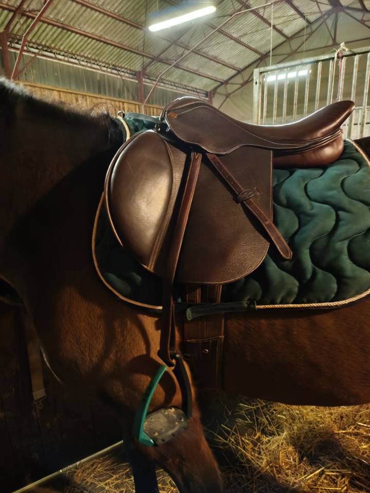 Selle Havane, cuir , utilisée pour du loisir sur un pur sang.