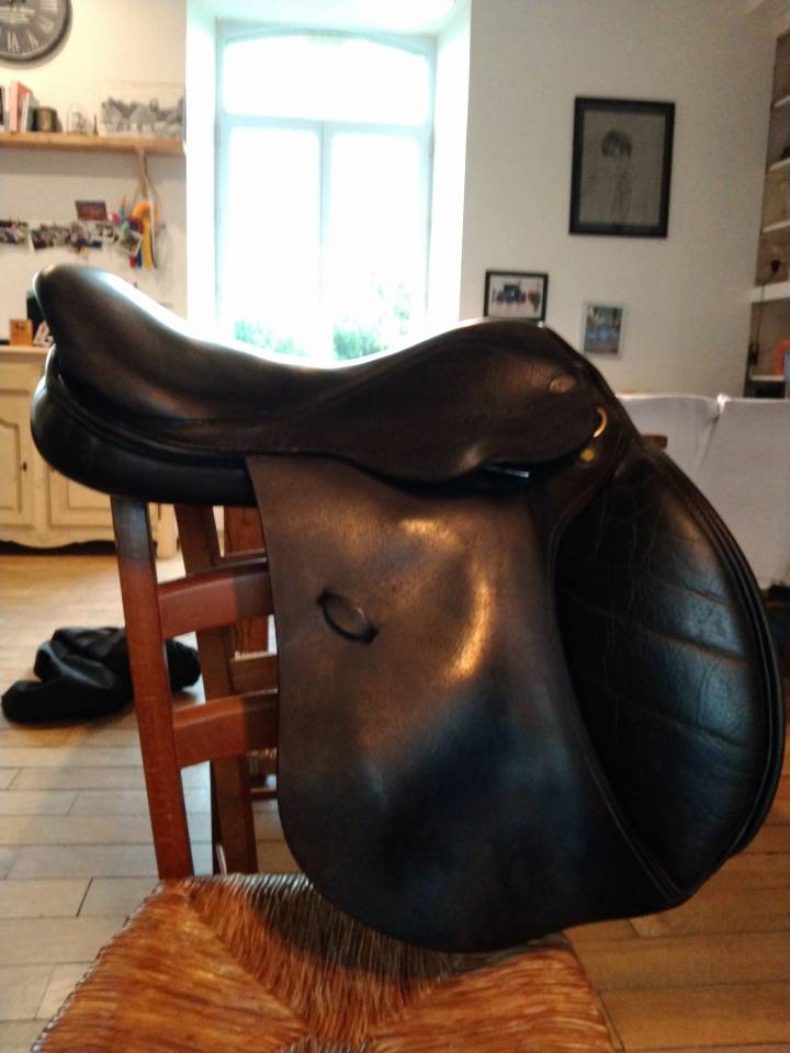 Selle Éric thomas mixte modèle Saumur 17 pouce bon état je ne connais pas l'année de fabrication, confortable. Léger accro au niveau du troussequin voir photo.