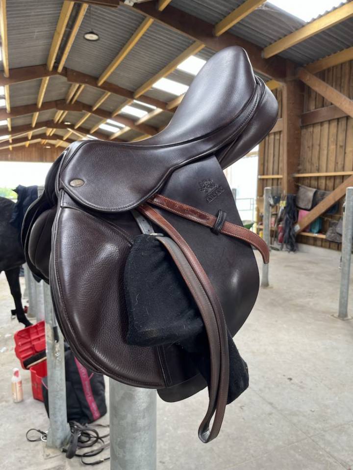 Bonjour, je vends une selle Havane cuir Fairfax Taille 17,5 datant de 2022 car elle ne convient pas à la morphologie de mon cheval. C'est une classic jump cupped flap entièrement modifiable par un saddle fitter. Actuellement la selle est équipée d'une arcade bleue, elle sera vendue avec. La selle sera vendue nue (sans étrivières et értiers), par contre je donne la bavette.