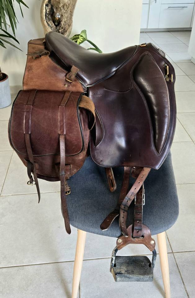 Vendue également avec des sacoches de randonnées qui s'adapte à la selle, une sangle et des étriers ( qui sont un peu moins neufs )