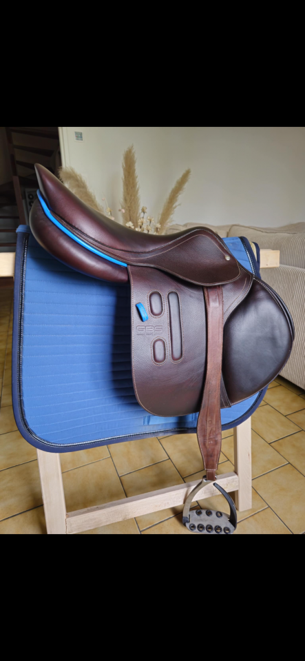 Suite à l'arrêt de l'activité équestre je vends ma selle complète GBS taille 18.5 4AV3+ (quartier adaptés pour cavalier de +/- 1m90) avec étrivières monobranche taille L, étriers vita stirrup avec housse de protection (voir photos).
