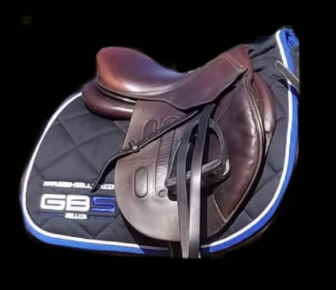 Selle gbs semi creuse, 16.5 pouces (le siège convient bien pour un adulte de morphologie standard). Un vrai fauteuil tant pour le cavalier que pour le cheval (convient à beaucoup de chevaux car gouttière très large et bonnes matelassures). Selle mixte plutôt orientée cso. Sera envoyée avec les étrivières et le protège selle. Bien utilisée mais bien entretenue. Cuir un petit peu râpé sur un quartier (voir dernière photo), mais facile à faire reprendre chez un cordonnier. Ne gêne en rien l'utilisation, simplement esthétique. Possibilité de vendre avec les étriers, une bavette en 125, une sangle anatomique CWD en 125 en parfait état, et un ensemble bonnet tapis gbs. A venir chercher sur Paris (75) ou Besançon (25) ou envoi possible.