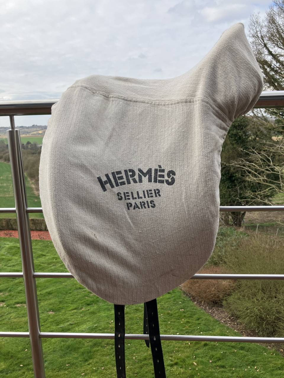Selle HERMES dressage noire modèle Corlandus, un des rares modèles de selle de dressage de la Maison HERMES, fabriquée en cuir de buffle, très robuste. 17 pouces. Toujours très bien entretenue, en bon état. Livrée avec sa housse de protection.
