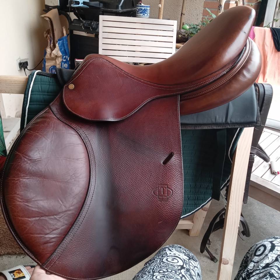 Selle Tolga, marque belge. Cuir havane très confortable et bien entretenu. Maintient bien en place - idéale aussi bien pour la rando et le dressage que pour le saut.