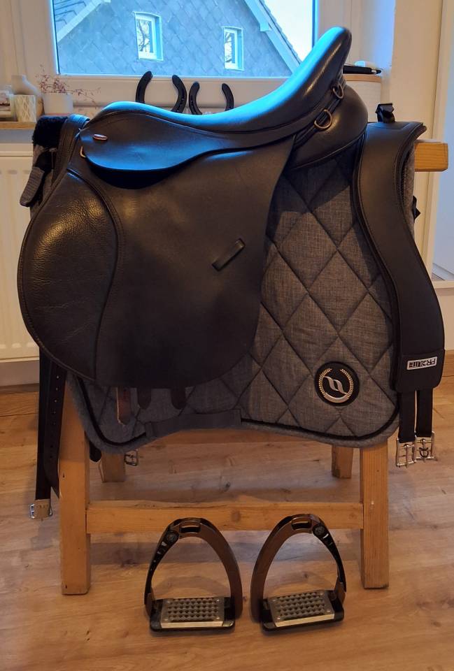Brune, mixte, taille 17, arcon interchangeable, taquet velcro, intérieur en laine, toujours suivie par une saddle fitteuse, vendue complète avec housse, sangle Prolite, étrivière Kent&Masters et étriers sécuritaire Acavallo bronze.