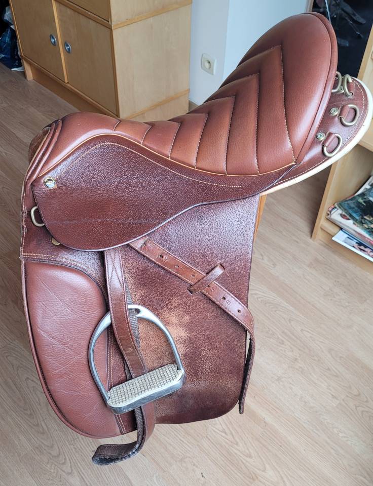 Selle mixte tendance randonnée avec ses matelassures allongés et ses nombreux anneaux pour sacoches mais possible de l'utiliser sur le plat ou pour petits obstacles. Selle confortable utilisée sur un anglo-arabe au garrot assez proéminent. Marque Pringamoza en cuir marron 17 pouces.