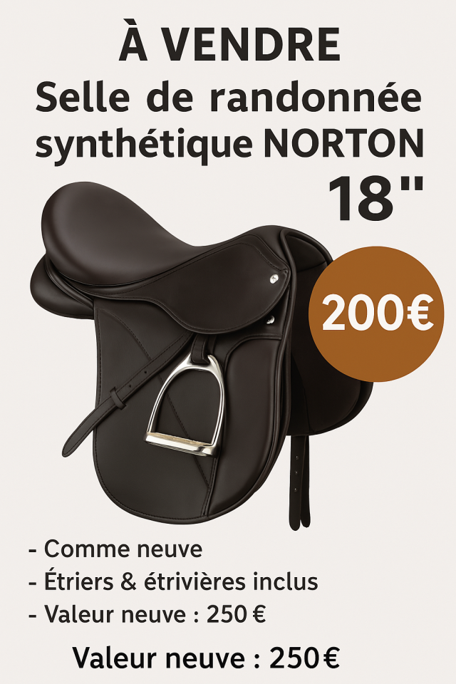 Je vends une selle de randonnée Norton synthétique 18 pouces, en excellent état, essayée une seule fois.