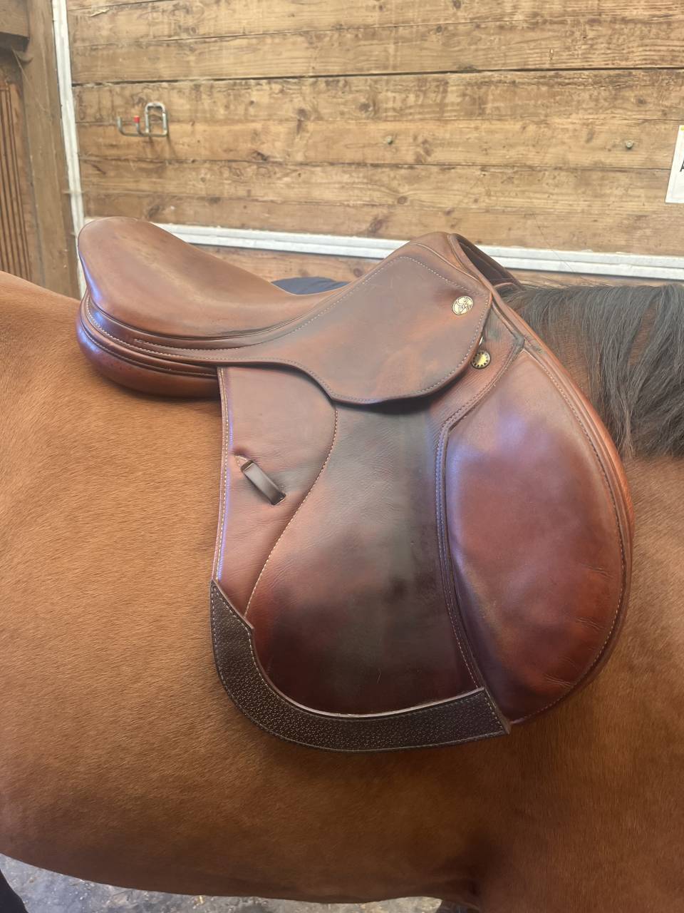 ✅ Bon état général : quelques taches sur le cuir (sans impact sur l'utilisation) et légères rayures sur le pommeau et troussequin (quasi invisibles)