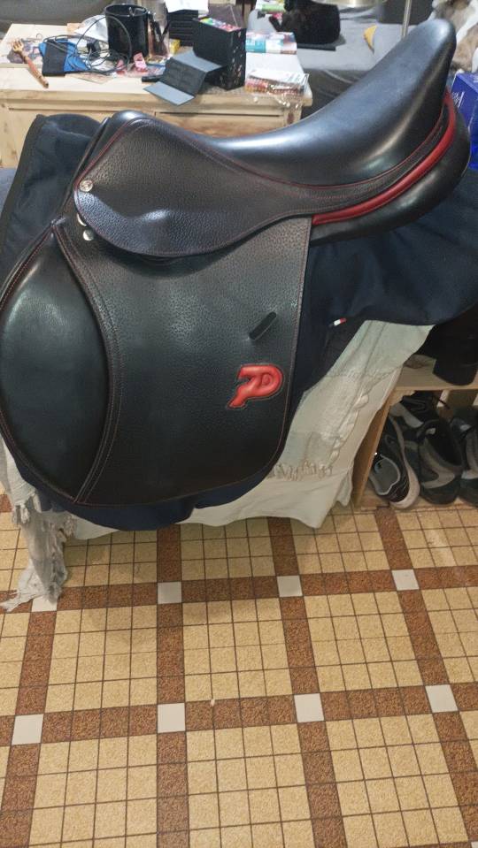 I am selling my Privilège Equitation Bordeaux 17" jumping saddle, in black leather with red trim.