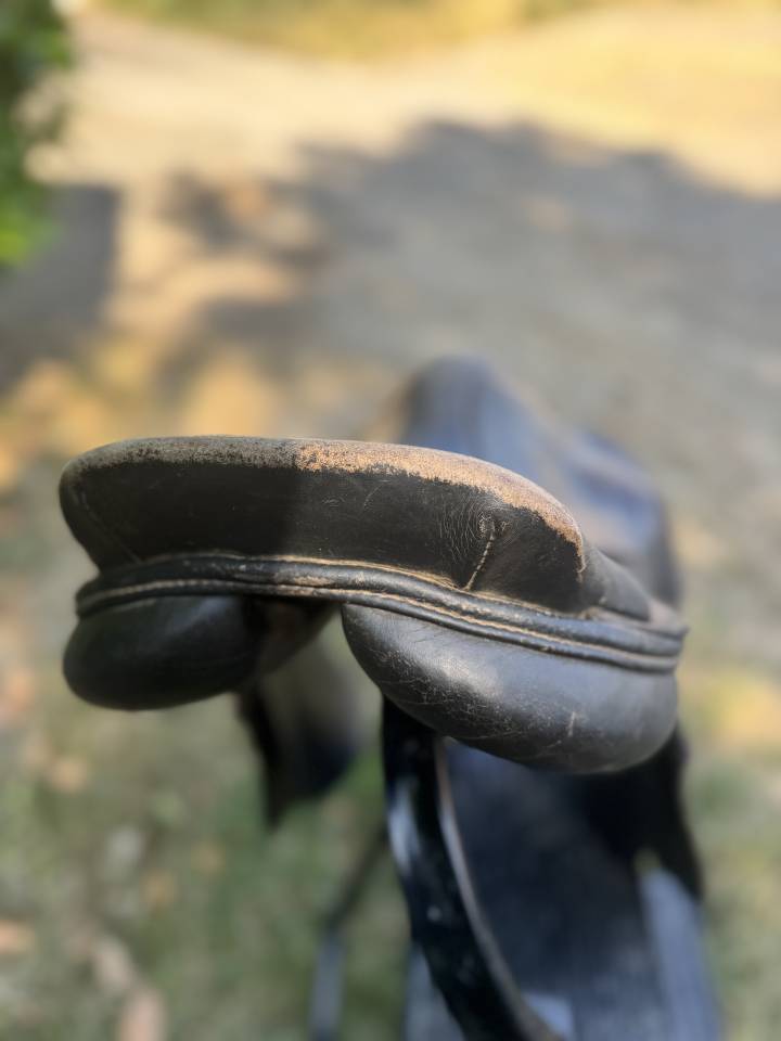 Selle noire, traces d'usure ( décoloration) au niveau du pommeau et troussequin mais pas d'accrocs. L'´ardillon de la sangle a marqué l'intérieur du quartier.