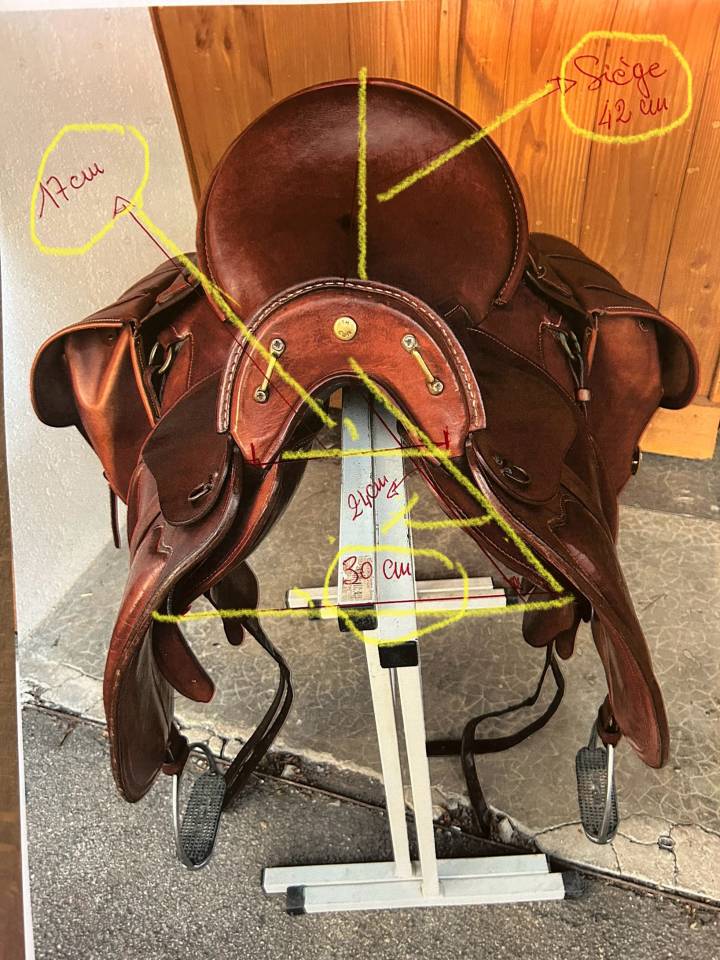 Vends selle de randonnée TH Cuir modèle ARVERNE avec sacoches et collier de chasse. Selle Bon état et complète excepté la sangle- Sacoches état neuf - Collier de chasse très bon état. Mesures de la selle à voir dans les photos. Selle numérotée. Sanglage 3 points pour le confort du cheval. Mousse à mémoire de forme pour le confort du cavalier. Selle année 2003, peu utilisée ces dernières années.