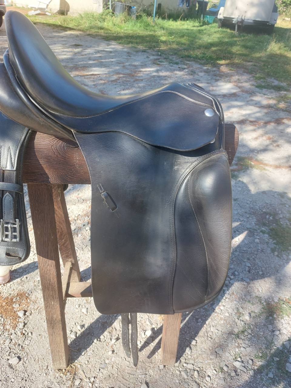 Selle de dressage de marque Zaldi. Taille : 17,5. Convient à pas mal de morphologie de chevaux. Confortable pour le cavalier. Quelques griffes sur le troussequin et des marques d'usage sur les quartiers. Ideal pour quelqu'un qui veut une première selle de dressage sans y mettre une fortune.
