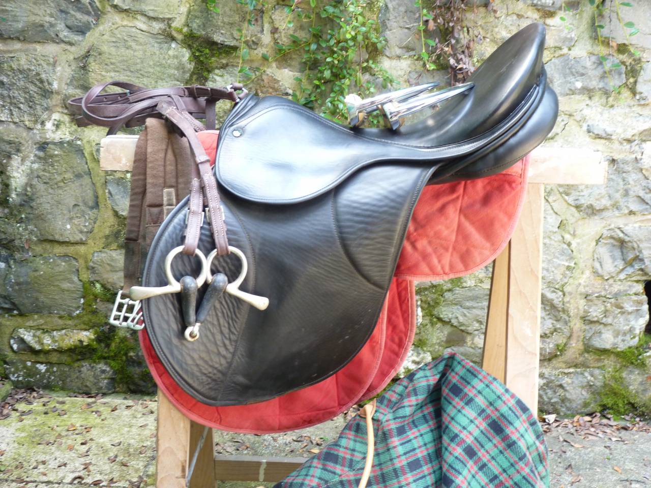 Inclus : étrivières, etriers, mors simple résine, nombreuse brides, tapis et housse. Etat impeccable, usure d'usage. Essayage possible sur votre cheval avant achat. Prix à débattre.