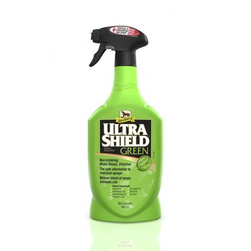 Repousse les tiques, les taons, les mouches piqueuses, les moustiques et les moucherons jusqu'à 8 heures. Ultrashield Green est à base de géraniol et d'extraits végétaux. Peut être utilisé sur chevaux, poneys, poulains et chiens.