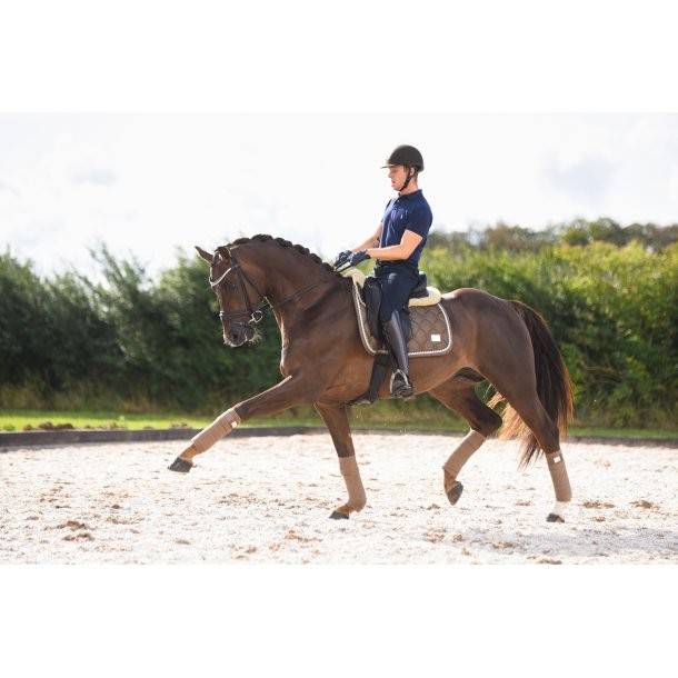 Les bandes sont fabriqués dans le même tissu d'aspect métallique brillant que le tapis de selle, et se marient parfaitement.
