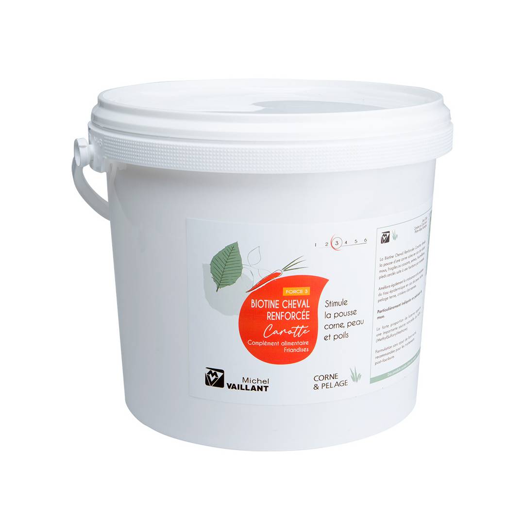 La Biotine Cheval Renforcée Carotte Force 3 en friandise peut être donnée à votre cheval toute l’année, sans modération, afin de couvrir ses besoins journaliers en biotine. La composition du produit étant très équilibrée, il peut être consommé sans risque.