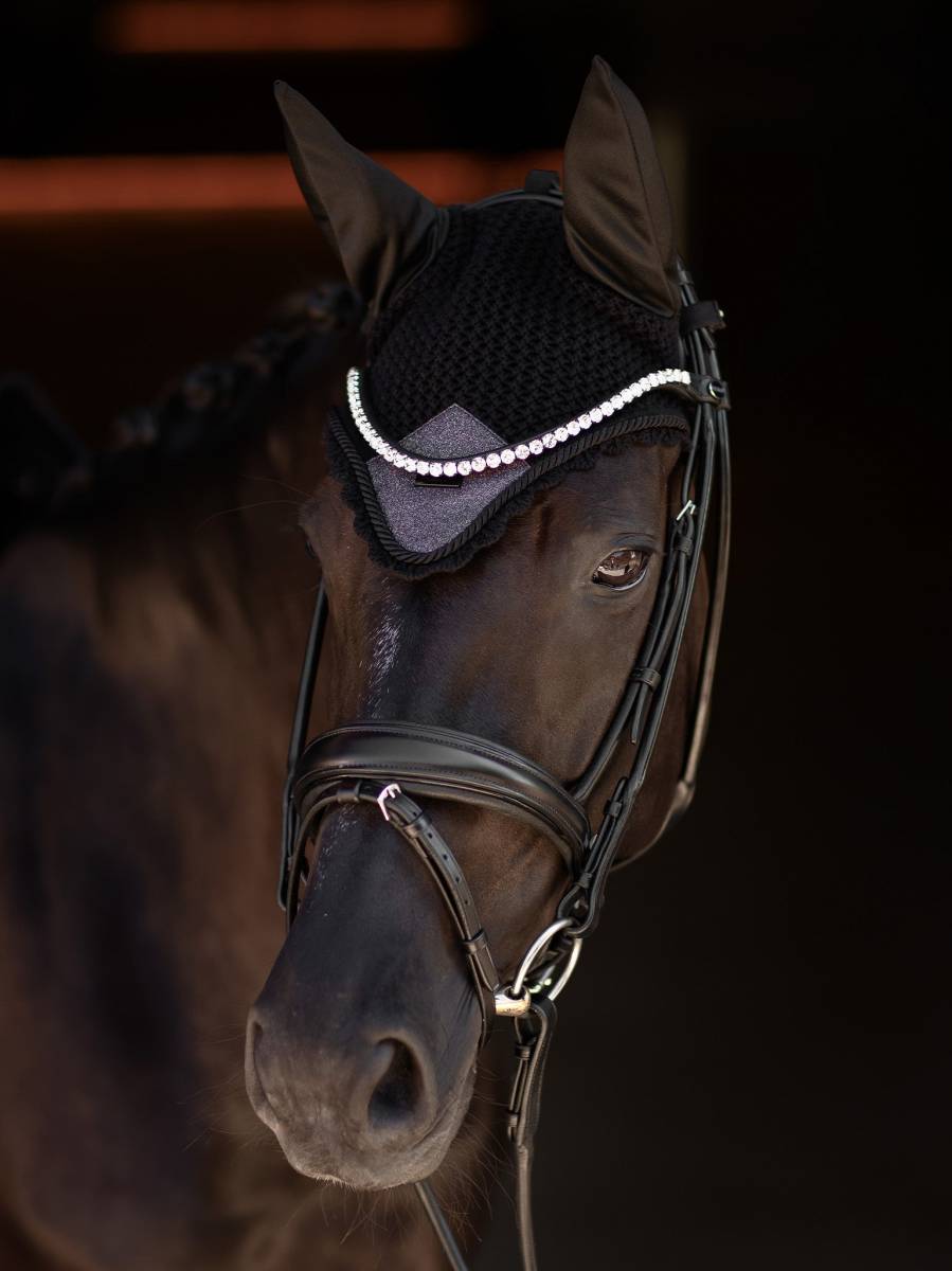 Bonnet anti-mouches crocheté dans une belle couleur noir. Décoré d'un patch en satin violet en paillettes sur le devant et d'un badge Equestrian Stockholm en noir.