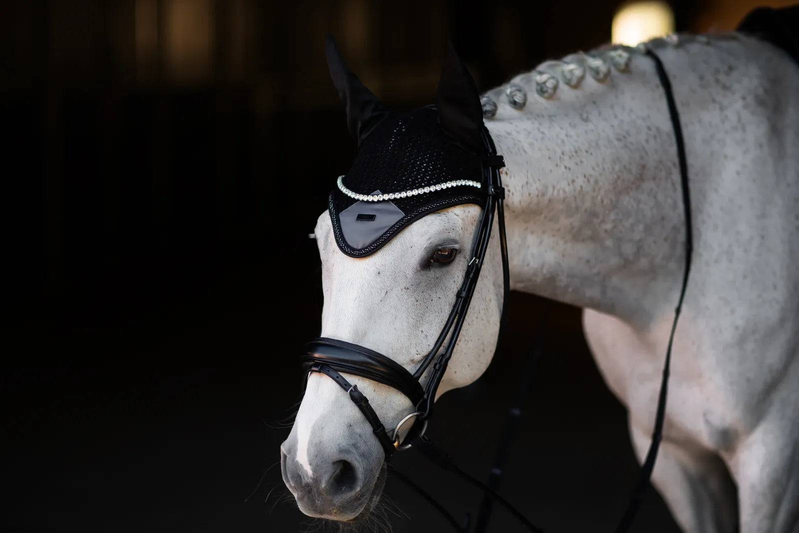 Bonnet anti-mouches crocheté dans une belle couleur noir. Décoré d'un patch en satin gris sur le devant, une bordure noire, une cordelette noir avec fils argentés et d'un badge Equestrian Stockholm en noir.