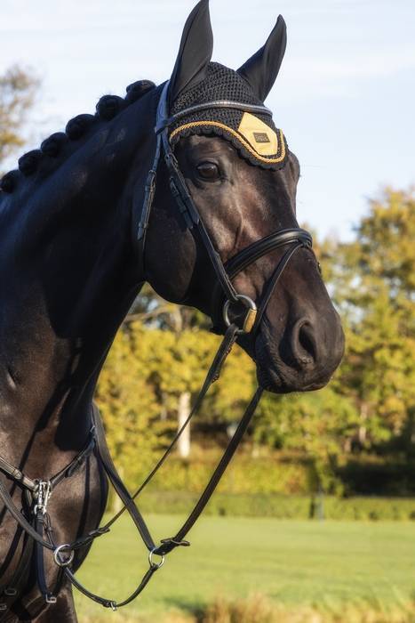 Cordelette jaune et bande pailleté noire. Logo doré et patch tissu satiné jaune foncé.