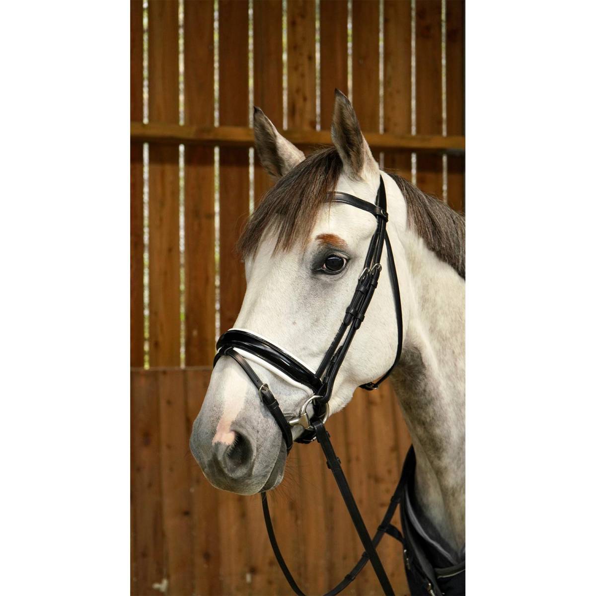 Ce bridon avec muserolle combinée large et vernie de la Working Collection de chez Dy'on est fabriqué avec le meilleur cuir de buffle.