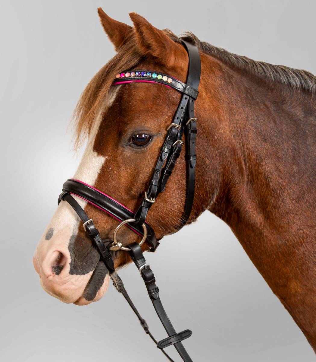 Bridon en cuirs de qualité noir et rose avec frontal orné de strass multicolores