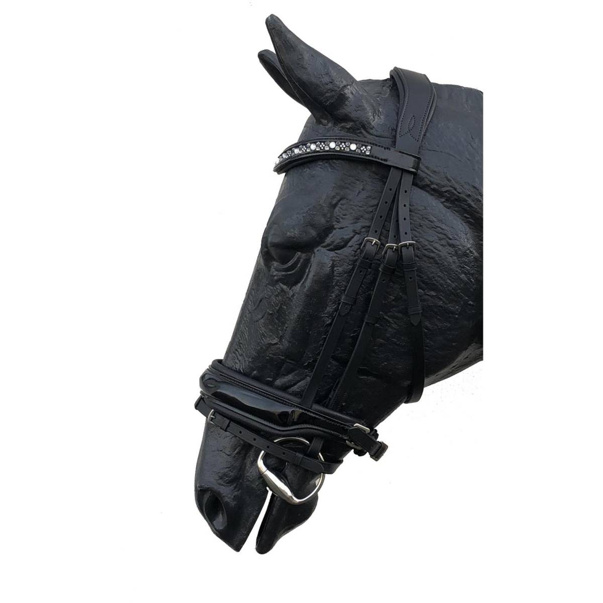 - La muserolle combinée large est vernie à l'avant et intérieurement, elle est doublée pour plus de confort pour votre cheval.