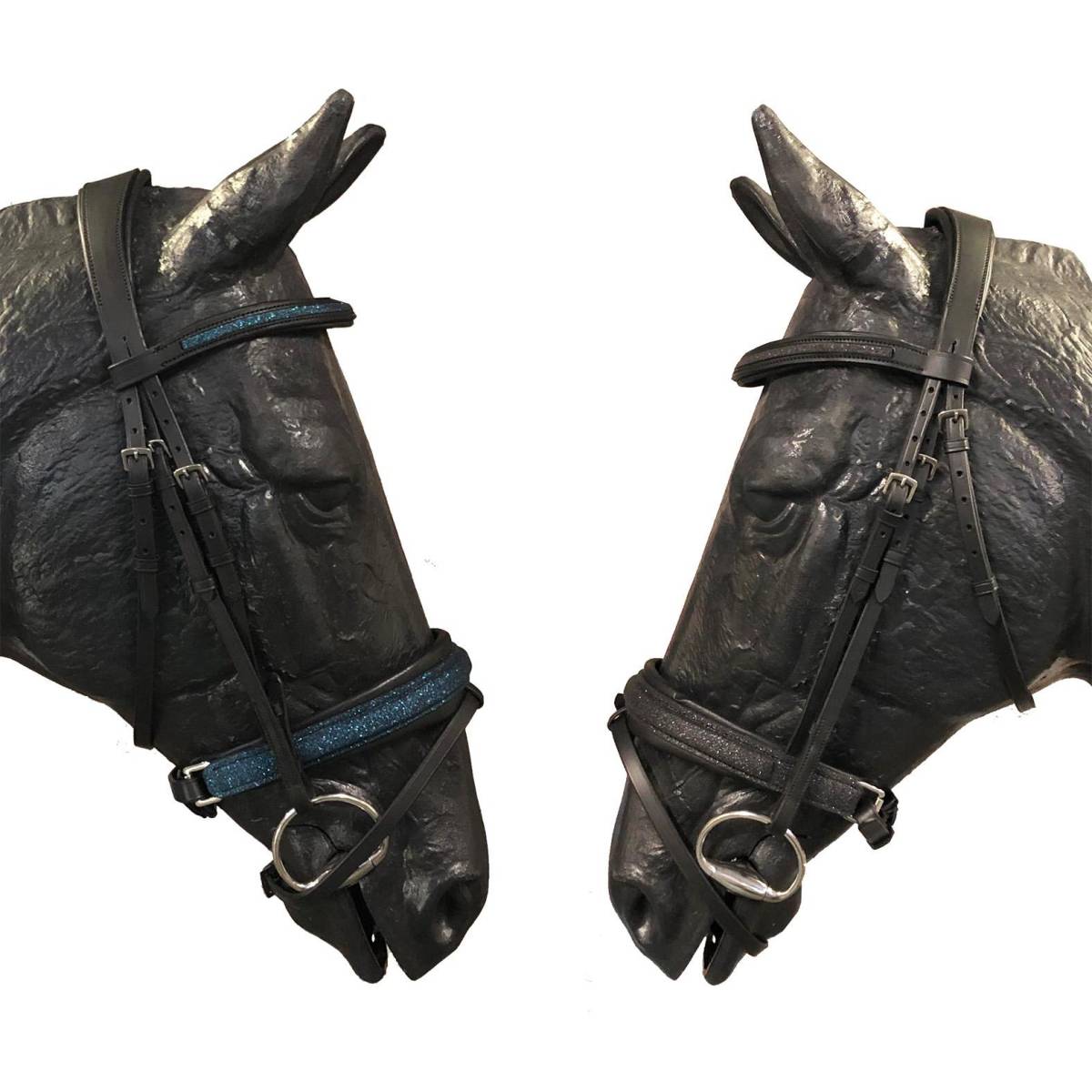 Le bridon Shiny de chez JMRPRO est sublime avec le frontal et la muserolle décorés avec du crystal fabric noir ou bleu royal.