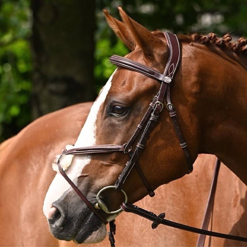 Son frontal et sa muserolle sont surmontés par un cuir carré surpiqué en blanc, ajoutant une touche d'élégance