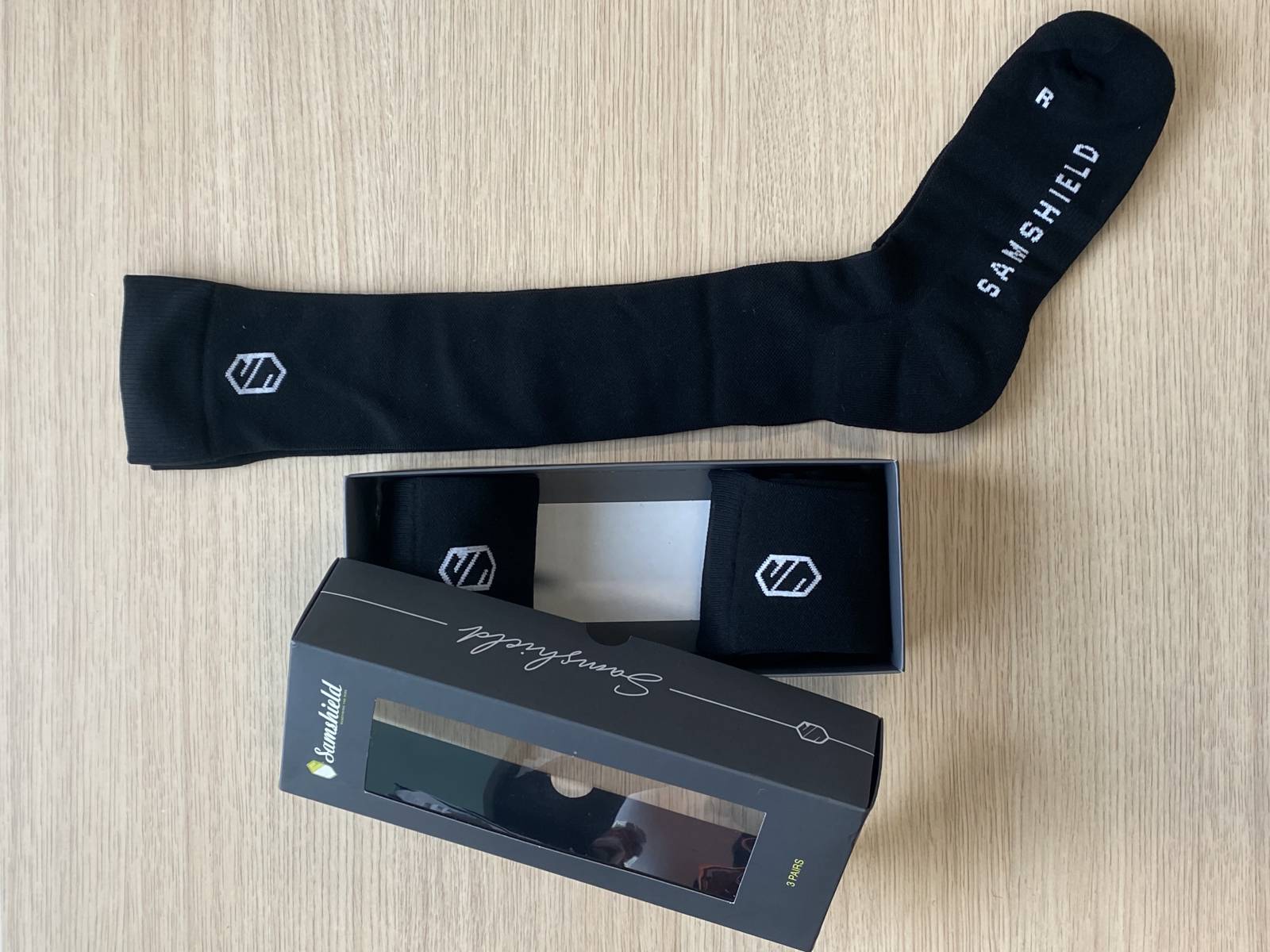 - Logo Samshield sur le haut de la chaussette.