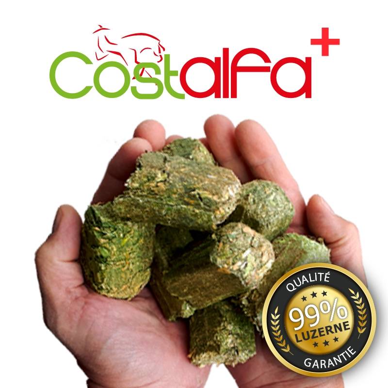 Wafer Costalfa + : 100% luzerne naturelle avec 16,2% de protéines sans amidon ajoutés mais aussi et surtout les additifs vitamines E/A, sélénium et oligo-élément, idéal pour les chevaux de sports !