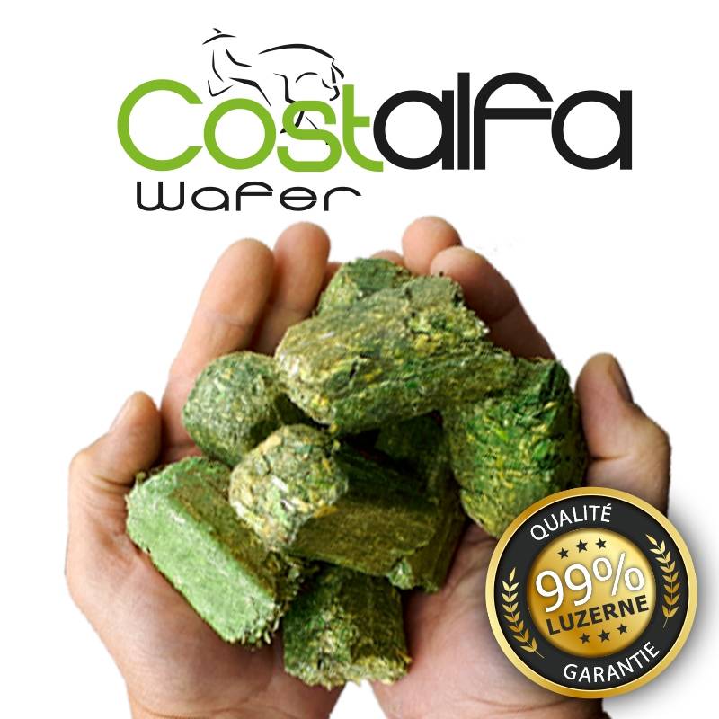 Le cube de luzerne Costalfa Wafer est composé à 99% de luzerne Déshydratée , non hachée et en fibres longues et compactée en cube de 3x3cm.