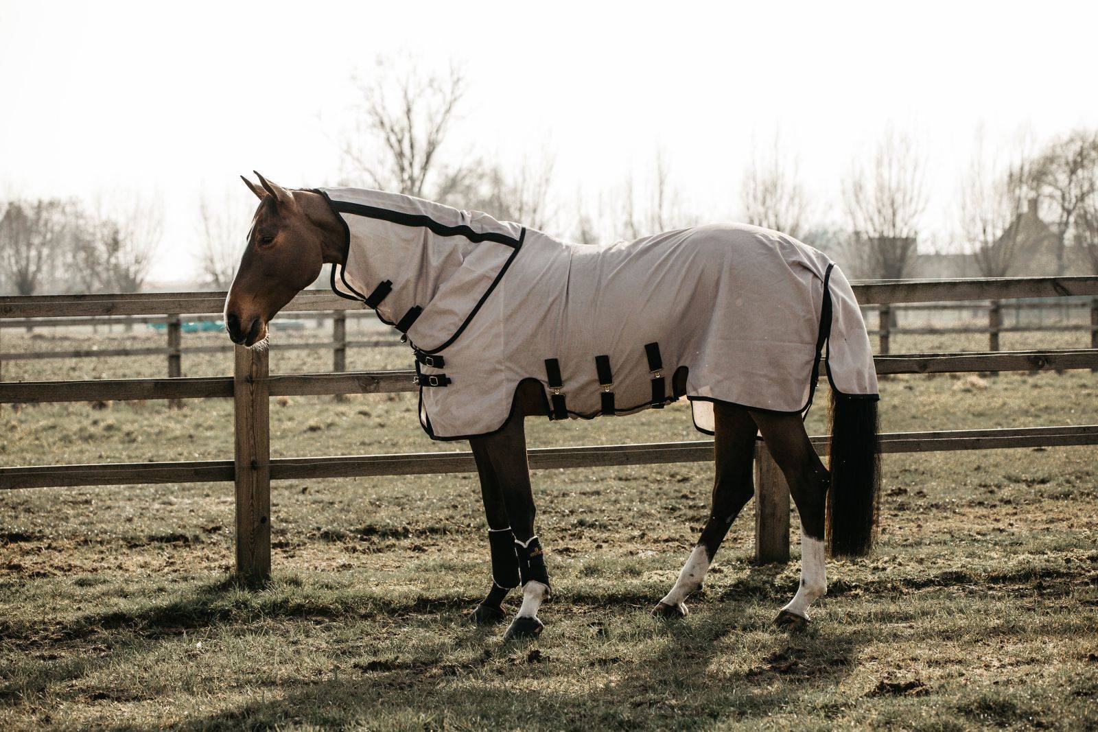 La couverture anti-mouches est fabriquée à partir d'un tissu à mailles dense et structuré, qui empêche la plupart des insectes d'entrer. La maille est extrêmement solide et sera un compagnon de terrain idéal pendant de nombreux étés. Le tissu est plat à l'intérieur, ce qui donne une sensation de douceur et garantit qu'aucun poil ne collera à la couverture. Grâce à la couleur claire de la couverture, elle réfléchit les rayons du soleil et n'absorbe pas la chaleur. La maille fine permet toujours la perméabilité à l'air. La zone de la crinière, du poitrail et de la queue est doublée d'un polyester lisse pour éviter les frottements.