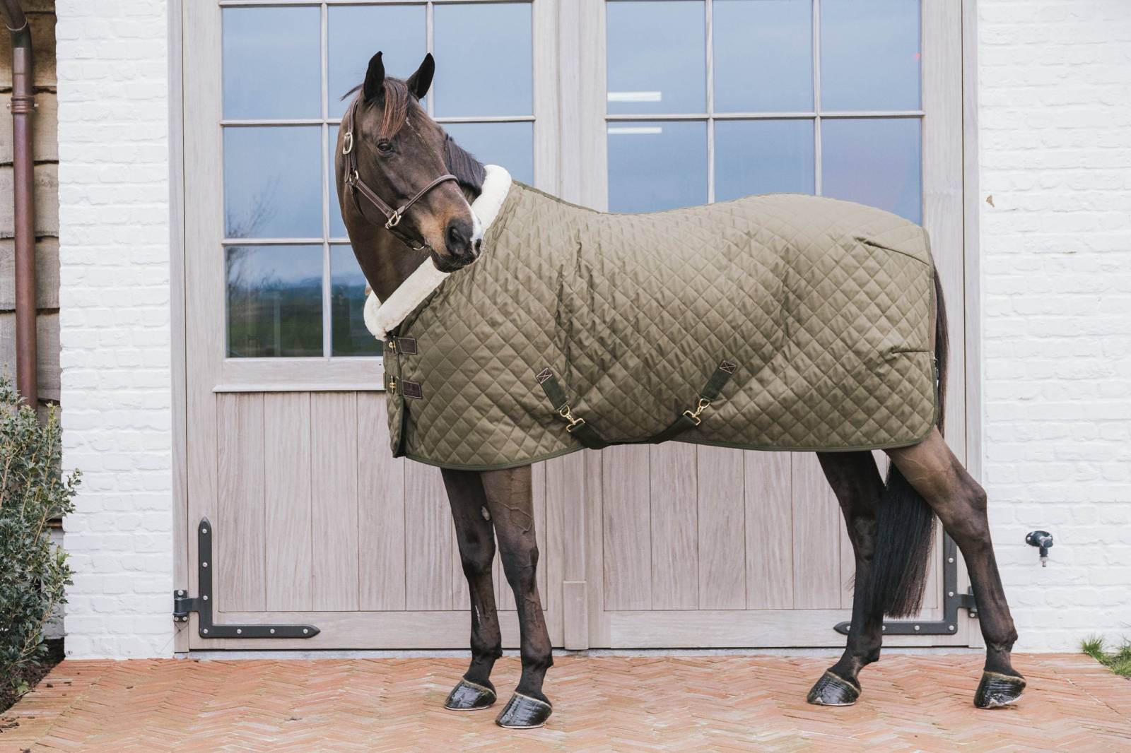 La couverture de présentation est fabriquée en polyester haute ténacité 600D avec un surpiquage en diamant à la fois élégant et intemporel. Cela rend la couverture incroyablement difficile à déchirer et évite que les copeaux ne collent à la couverture. Pour éviter toute pression sur l'épaule et le garrot, le col de la couverture Show Rug est fabriqué à partir de notre populaire peau de mouton artificielle. Outre son aspect élégant, la peau de mouton artificielle est également beaucoup plus confortable. Par exemple, lorsque le cheval mange, la couverture n'appuiera pas sur la poitrine. La couverture est remplie de 160 g de fibres de rembourrage, qui ont les mêmes performances que le duvet mais n'absorbent pas les odeurs. Pour éviter les marques de frottement, la couverture est doublée de notre peau de lapin artificielle. Ce tissu est extrêmement doux et crée un effet brillant sur le pelage du cheval. En plus de cela, la peau de lapin artificielle crée de minuscules poches d'air. Ces poches emprisonnent et retiennent la chaleur corporelle du cheval, créant ainsi une couche isolante supplémentaire. La combinaison de ces matériaux crée une couverture très respirante avec un rapport chaleur/poids élevé.