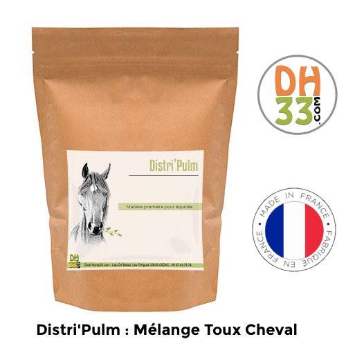 Distri’Pulm aliment complémentaire pour l'hygiène des voies respiratoires du cheval (toux, emphysème). Produit 100% naturel à base de plantes, conviendra également en phase de préparation pour les chevaux de sport. Pot de 400g ou 1kg