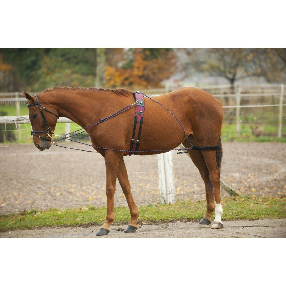 Un enrênement très complet qui favorise à la fois une bonne tenue de l'avant-main , une grande mobilité du dos et l' engagement des postérieurs du fait de son système à poulies et de son attache sur la partie supérieure du surfaix.