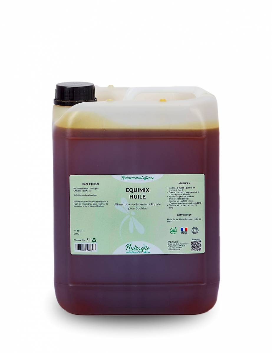 Equimix huiles est un mélange d’huile de lin, de colza et de maïs .