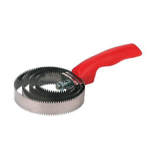 Poignée en plastique rouge - Lame métallique présentant des picots fins.